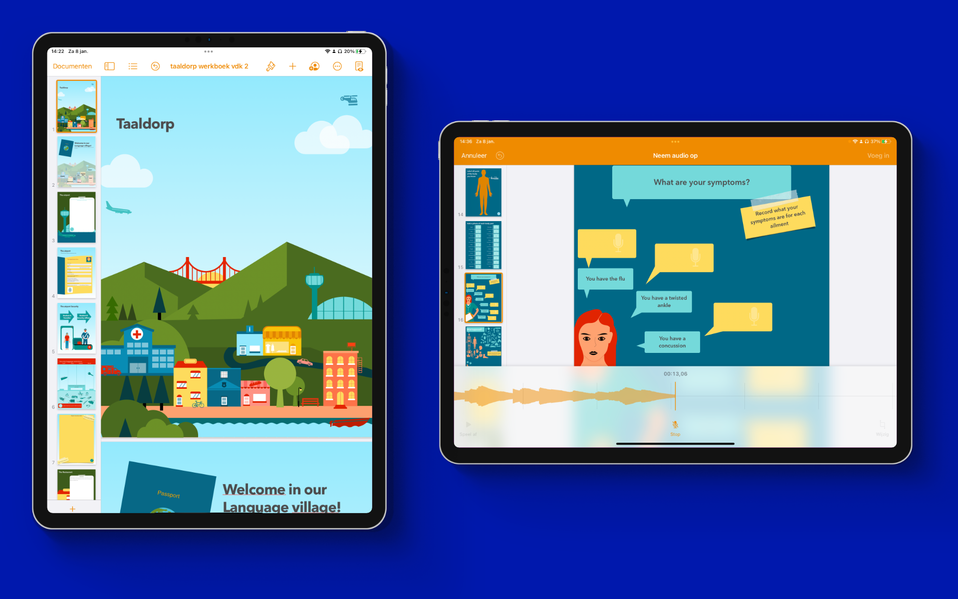 In dit interactieve werkboek gemaakt voor leerlingen met een iPad, bereid je jouw leerlingen voor op een Taaldorp. Door middel van 38 oefeningen leren ze de Engelse vocabulaire en oefenen ze gesprekjes in het ziekenhuis, restaurant, politiebureau, hotel, winkel, vliegveld en de VVV.